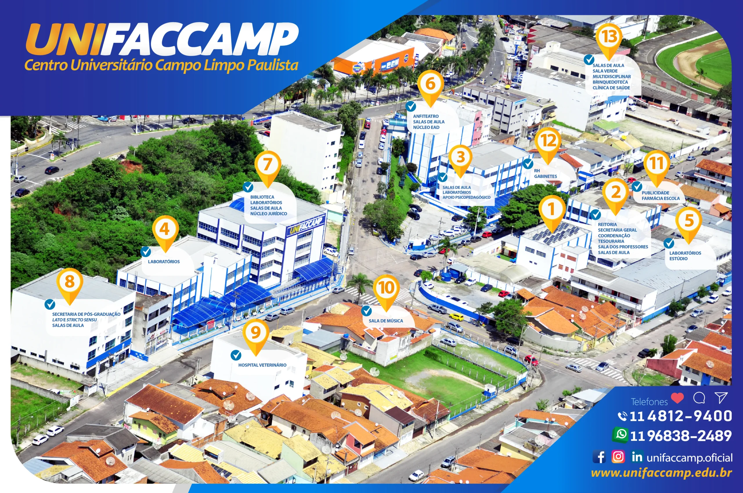 UNIFACCAMP: localização centralizada, fácil acesso para toda a região. A UNIFACCAMP localiza-se a 450 metros dos principais meios de transporte – Estação Rodoviária (ônibus municipais, intermunicipais) e Estação Ferroviária – tendo acesso direto das principais vias que atendem à região – Rod. Anhanguera; Estrada Velha de São Paulo; Rod. Dom Pedro I; Rod. Edgard Máximo Zamboto; Av. Marginal do Rio Jundiaí; Av. Adherbal da Costa Moreira (avenida principal da cidade de Campo Limpo) – veja mapa:
